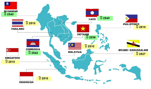 อาเซียน (ASEAN) ประกอบด้วย 10 ประเทศ ได้แก่ ไทย (2510)สิงคโปร์ (2510)อินโดเนเซีย (2510)มาเลเซีย (2510)ฟิลิปปินส์ (2510)บรูไน (2527)เวียตนาม (2538) ลาว (2540)พม่า (2540) กัพูชา (2542) มีประชากรรวมกันประมาณ 570 ล้านคน มีขนาดเศษฐกิจที่โตมาก